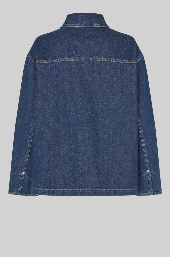 Jack van donker denim. De jas is gemaakt van katoenen denim met een donkerblauwe wassing en contrasterende stiksels. Voorzien van een normale kraag en metalen knoopsluiting. Drie opgestikte zakken aan de voorkant. Zilverkleurige merkdetails. Losse, rechte pasvorm..