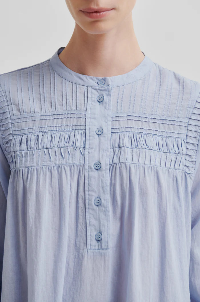 Blouse met lange mouwen van glad, lichtgewicht katoen. Met een ronde hals en een halve knoopsluiting. Stikdetails aan de bovenkant en schouders die structuur creëren. Lange mouwen met elastische manchetten. Relaxte en luchtige pasvorm.