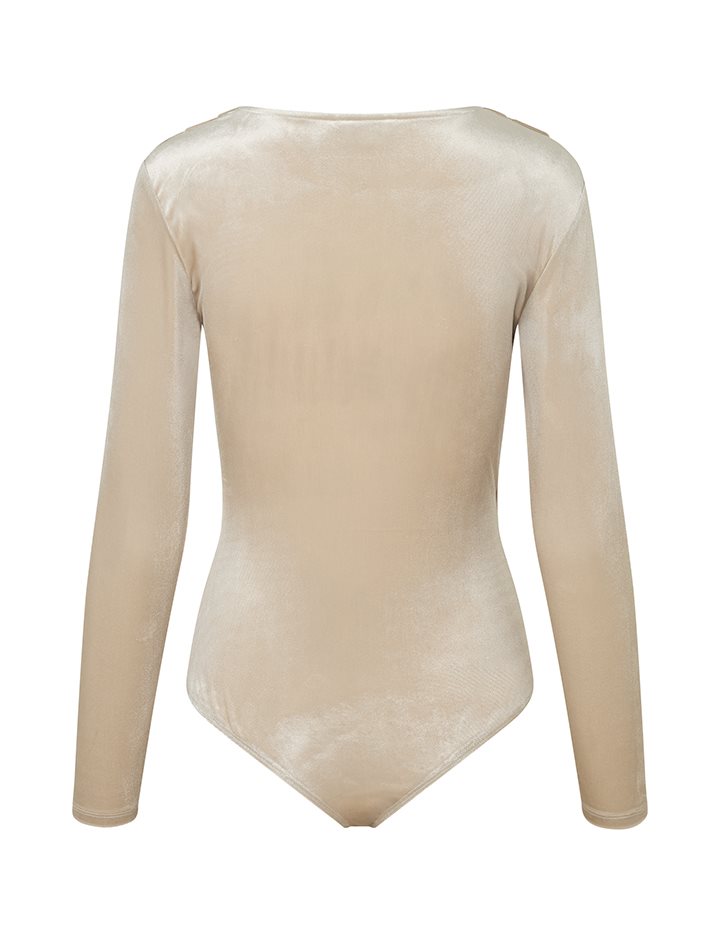 Vrouwelijke en elegante body in een fluwelen kwaliteit. Deze bodystocking heeft lange mouwen en een diepe v-hals. De top is perfect voor elke gelegenheid en kan voor verschillende looks worden gestyled.