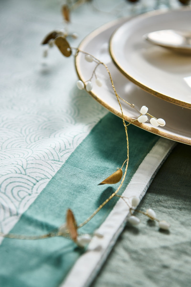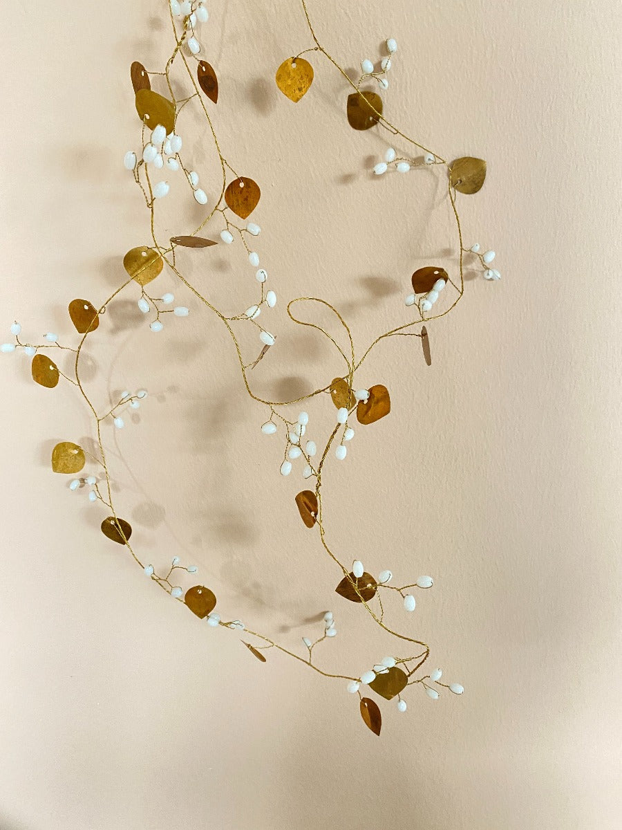 Breng feestelijke elegantie in huis met deze handgemaakte goudkleurige slinger, versierd met witte kunstbessen. Gemaakt van messing, voegt hij een warme en verfijnde touch toe aan elke ruimte.