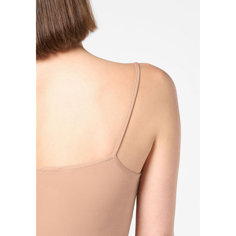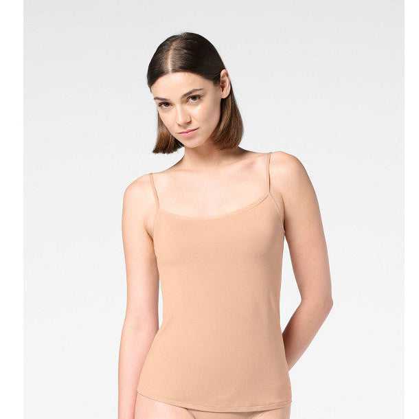 Top met spaghettibandjes, de hals is afgezet met een dunne transparante rand. Zeer zacht en soepel vallend, met de luxe uitstraling van zijde.